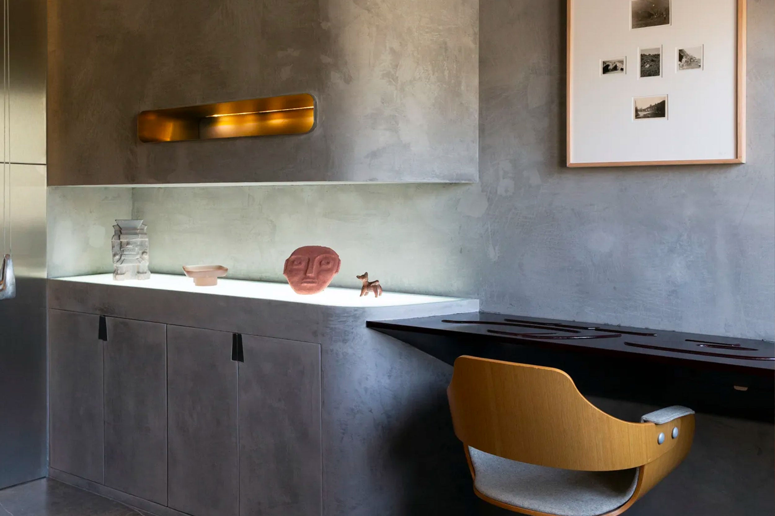 El proyecto replantea el antiguo espacio de biblioteca como nuevo estudio de trabajo, área de descanso y admiración de arte. El canvas neutro arquitectónico retoma los recursos de la misma casa. modernizándolos a la nueva casa mexicana, sirviendo de base expositiva para que las piezas de arte sobresalgan, y eligiendo piezas de mobiliario y accesorios escultóricos, rompiendo la linea entre el arte-objeto, para dotar al espacio de una esencia museográfica.