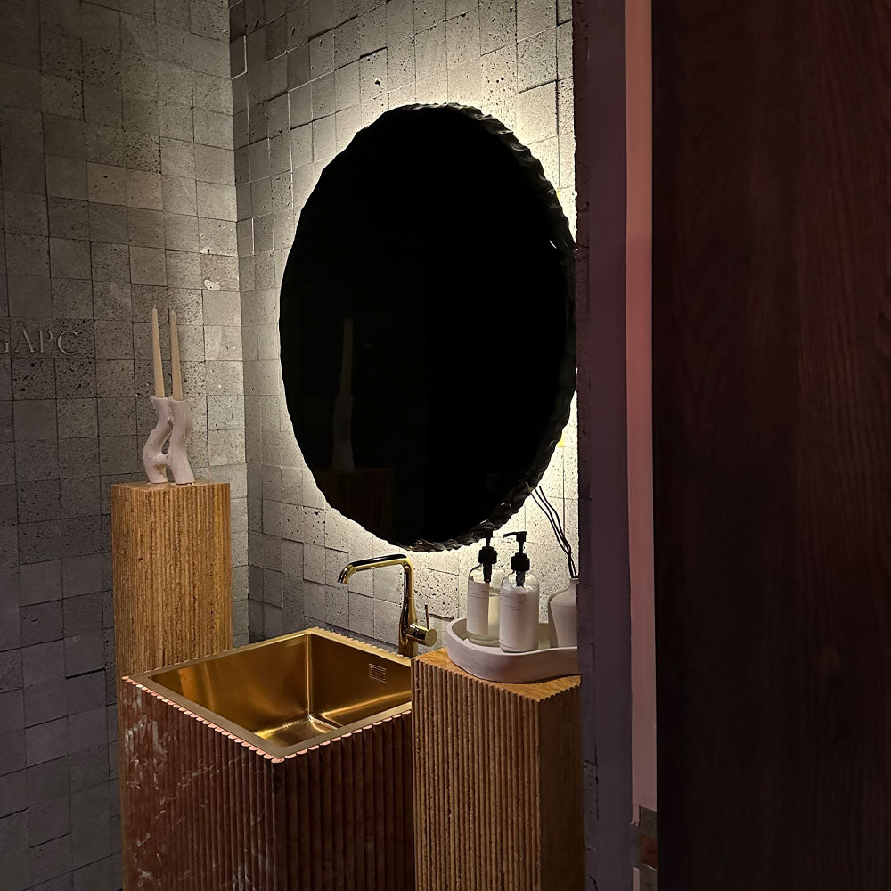 Tres pedestales de mármol reciben y están al servicio del elemento precioal en e espacio, quien lo habita. Se proponen Mármol Rojo Alcante y Travertino Amarila. Materiales de colores vibrantes que enaltecen la presencia del utuario. El uso de los acabados Estriado y Bamboo en los tres pedestales de piedra, representan is Individuaidad y versatilidad del protagonista, mientras que el basato, en su estado natural, ofrece una analogia de la autenticidas dei habitante. El mpejo de obsidiana le impide al visitante verso de manera individual.
