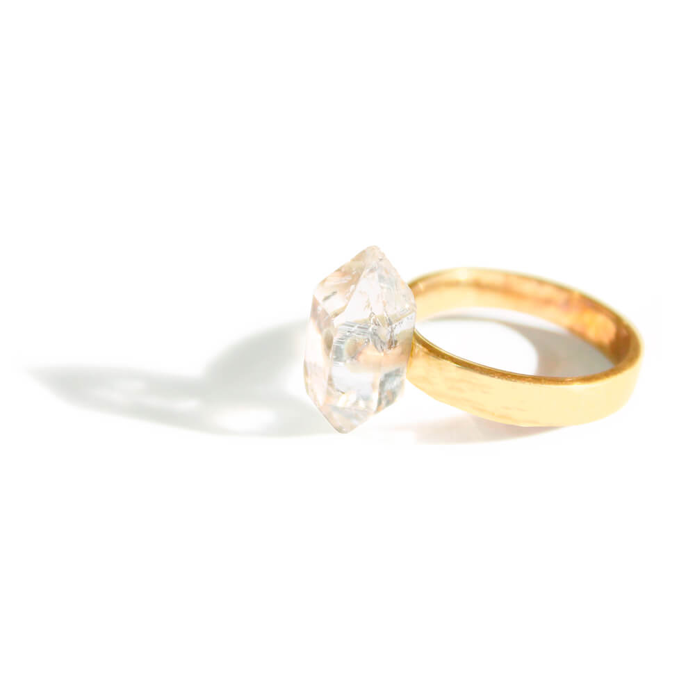 Anillo cuarzo herkimer con anillo de bronce con chapa de oro de 22 quilates.