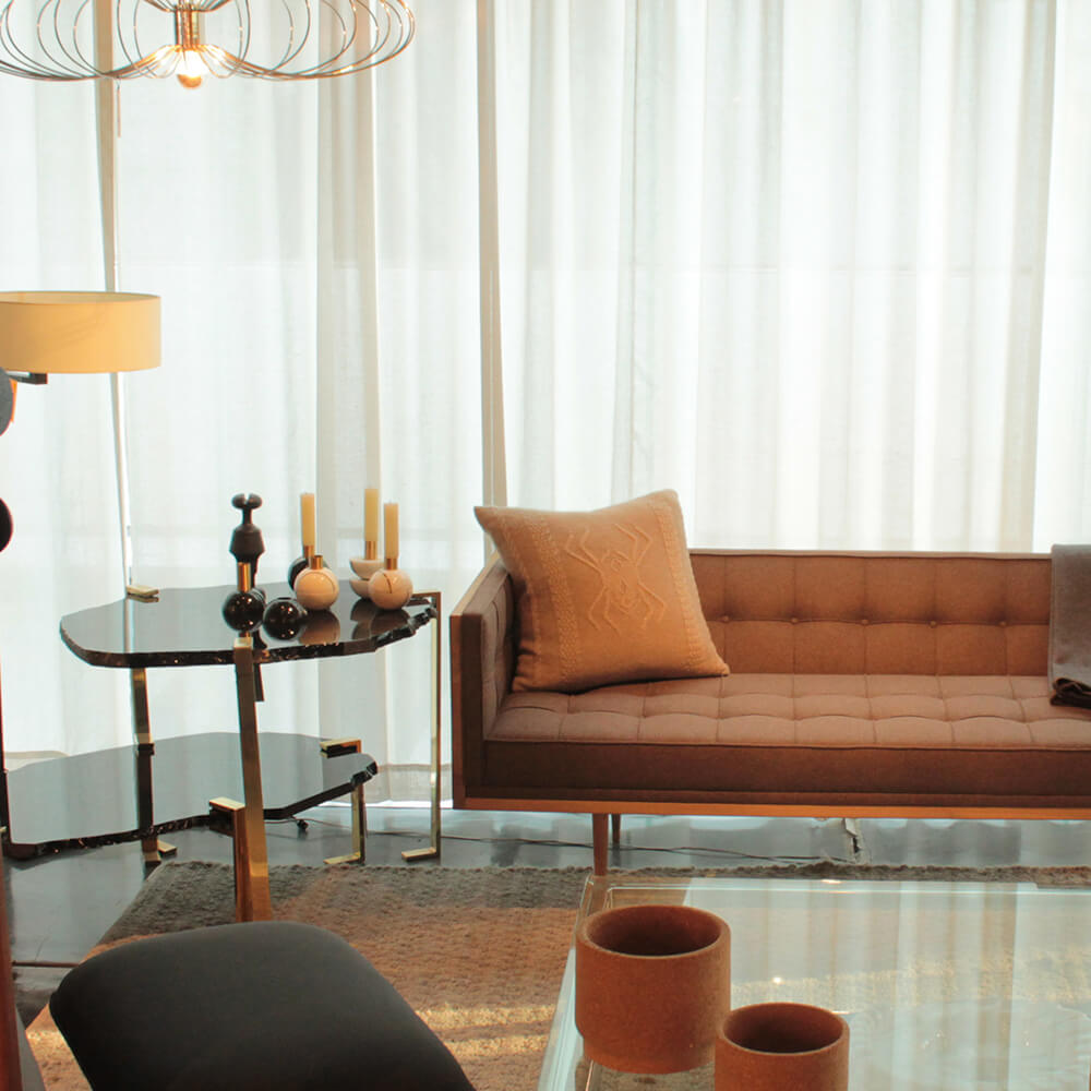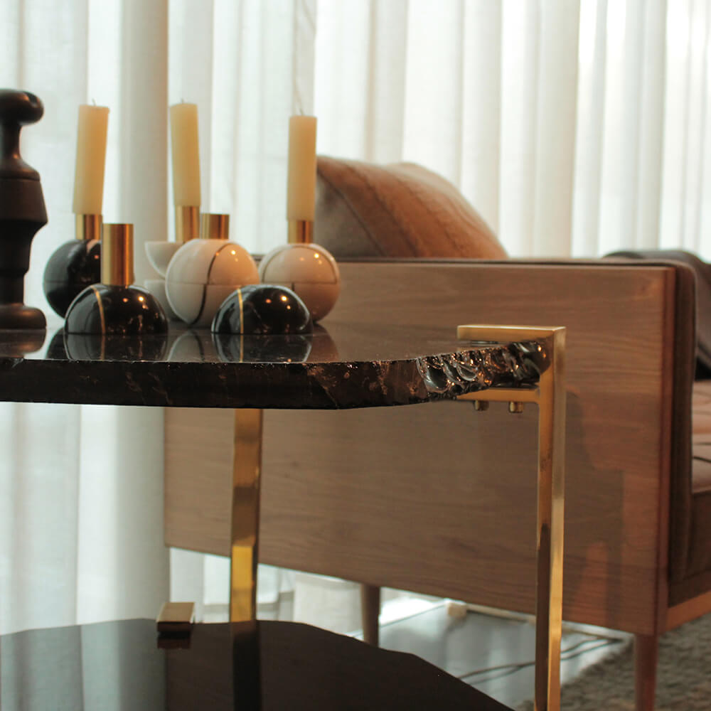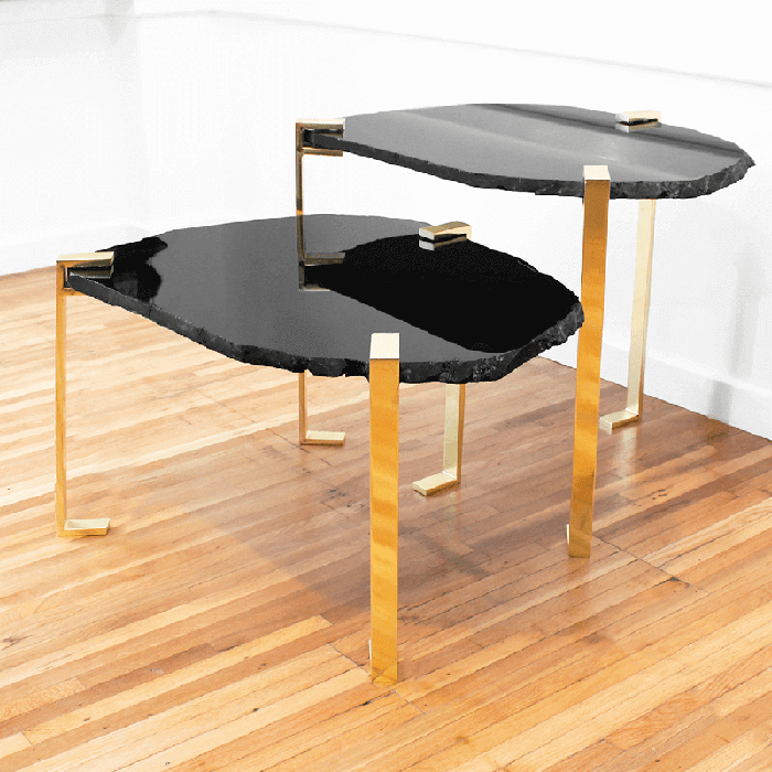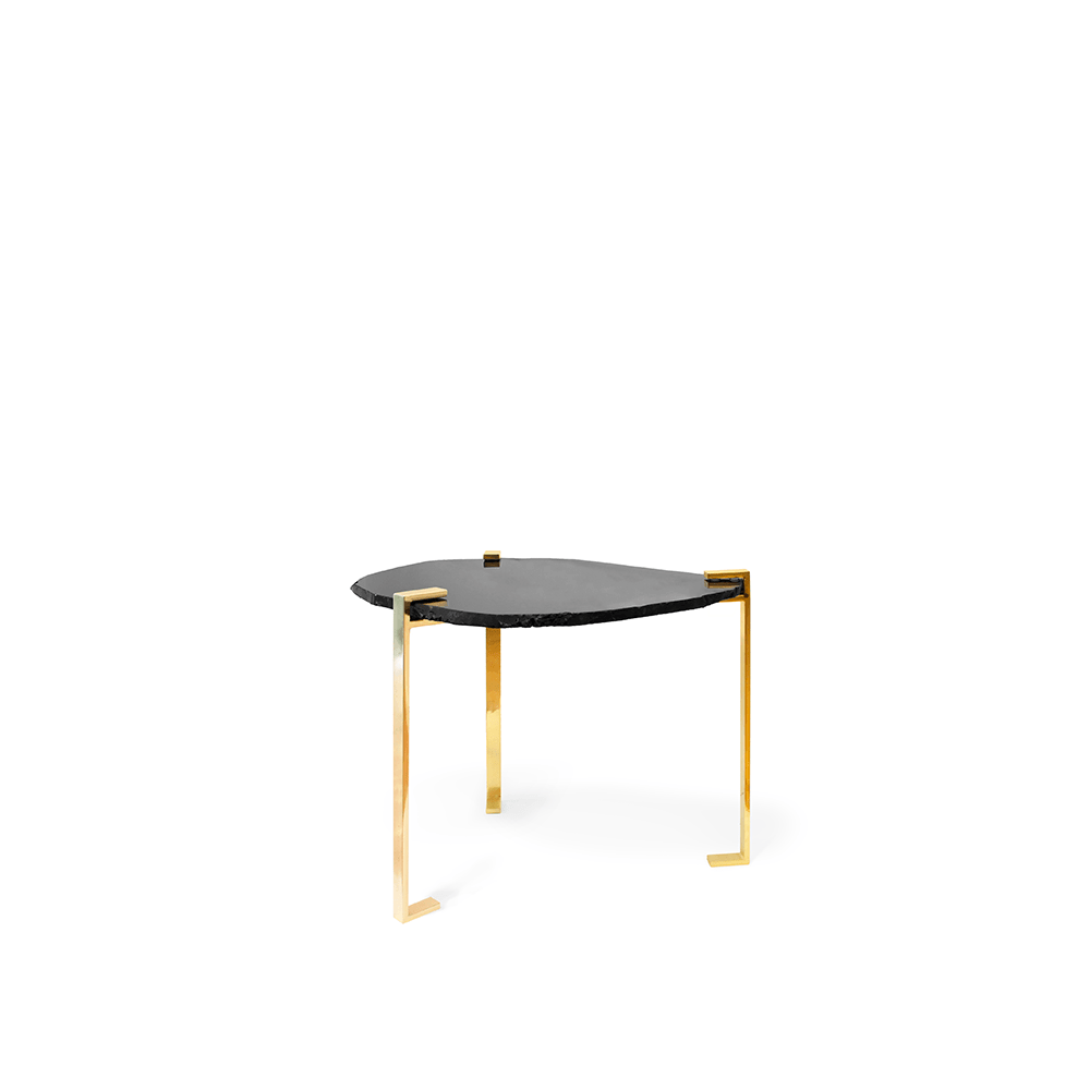 Mesa de obsidiana negra de una sola pieza, placa pulida y brillada acabado espejo con tres patas latonadas.
