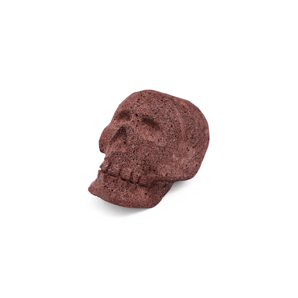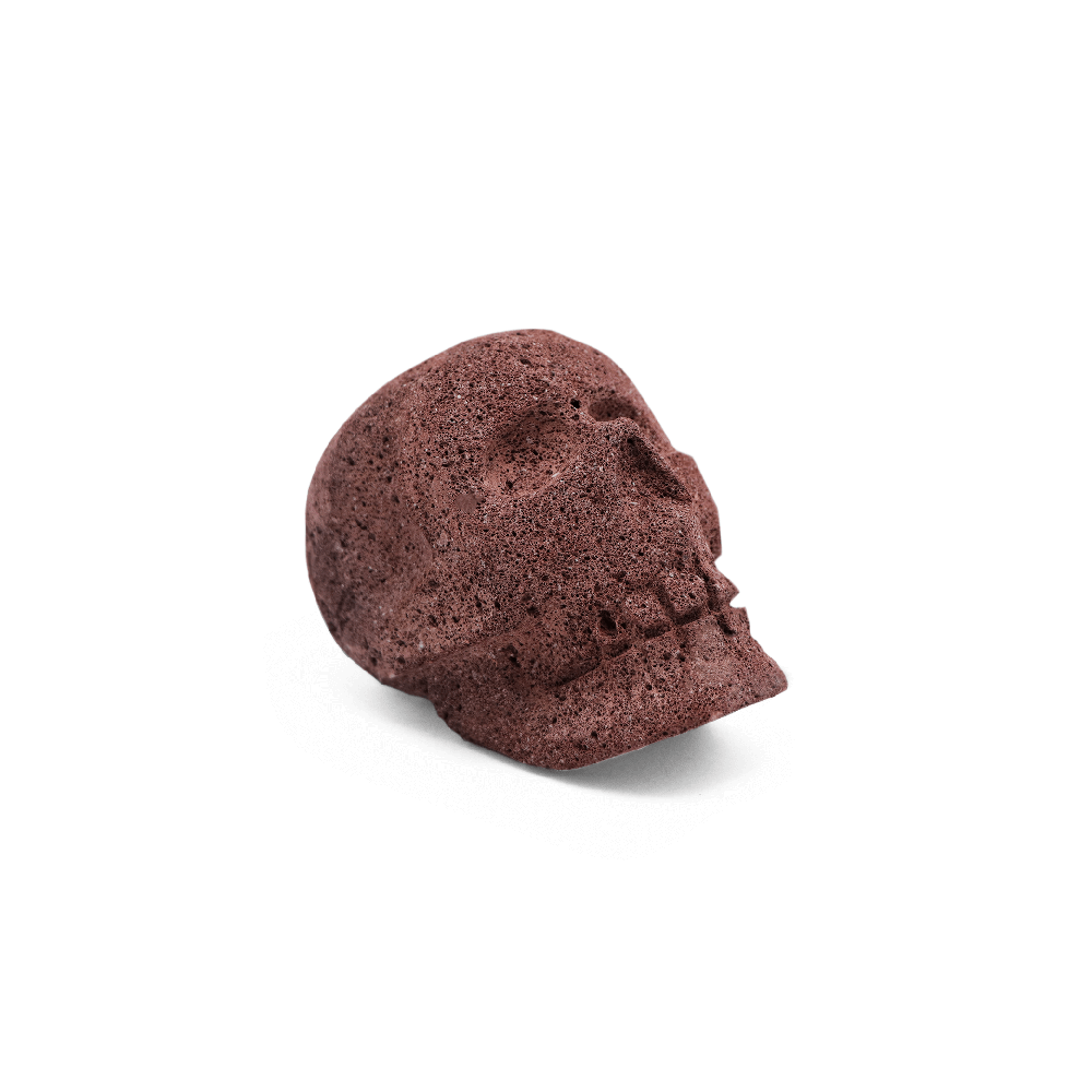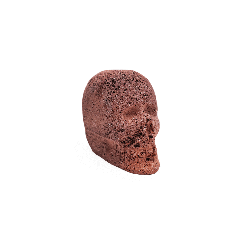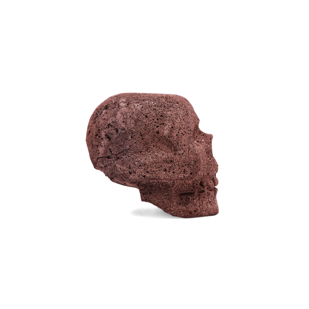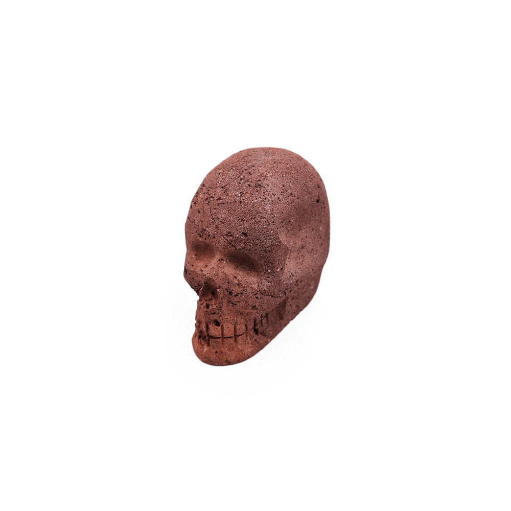 Este craneo esta hecho de tezontle, una piedra que al igual que la obsidiana es una roca de origen volcánico. En México se le puede encuentra en volcanes como el Popocatépetl e Iztaccíhuatl.
