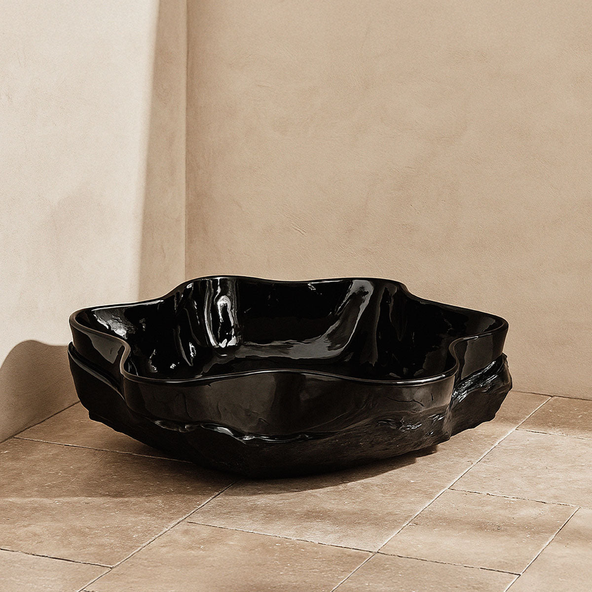 Frutero con forma de flor de 6 pétalos elaborado de corteza natural de obsidiana negra de 66cm de diámetro x 23cm de alto, 98kg aprox.