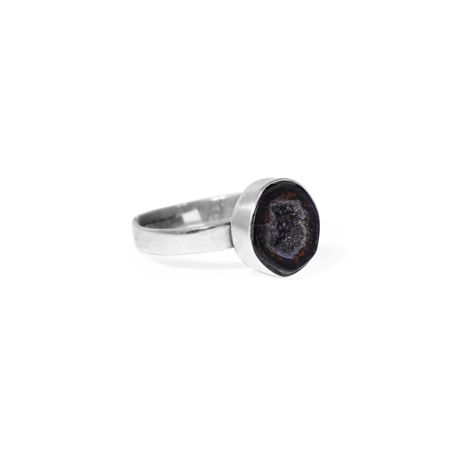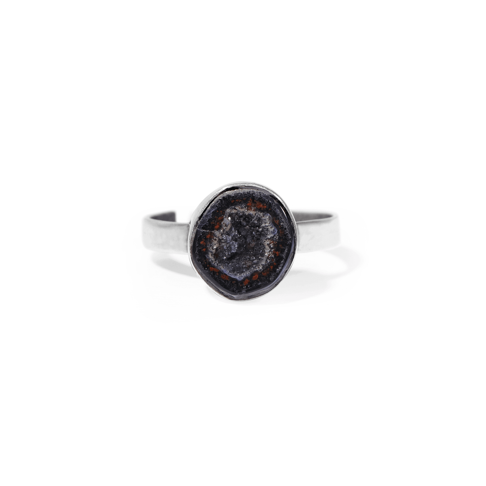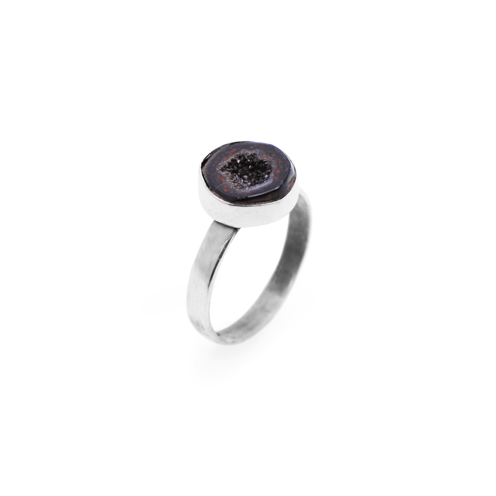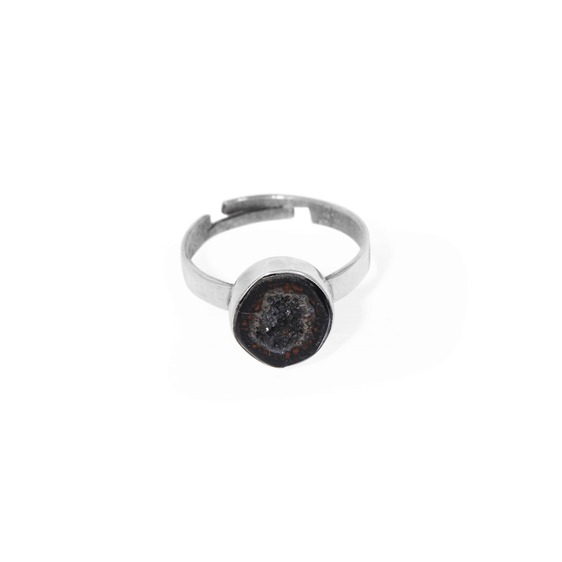 Micro geoda de cuarzo ágata de 1 cm de diámetro aproximadamente montado sobre plata 9.25 en un anillo ajustable.