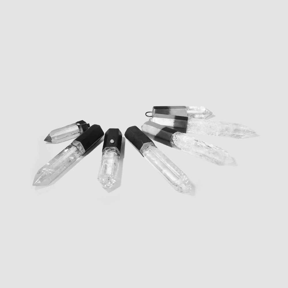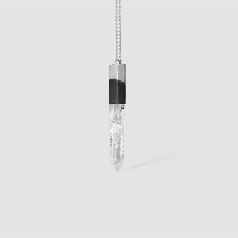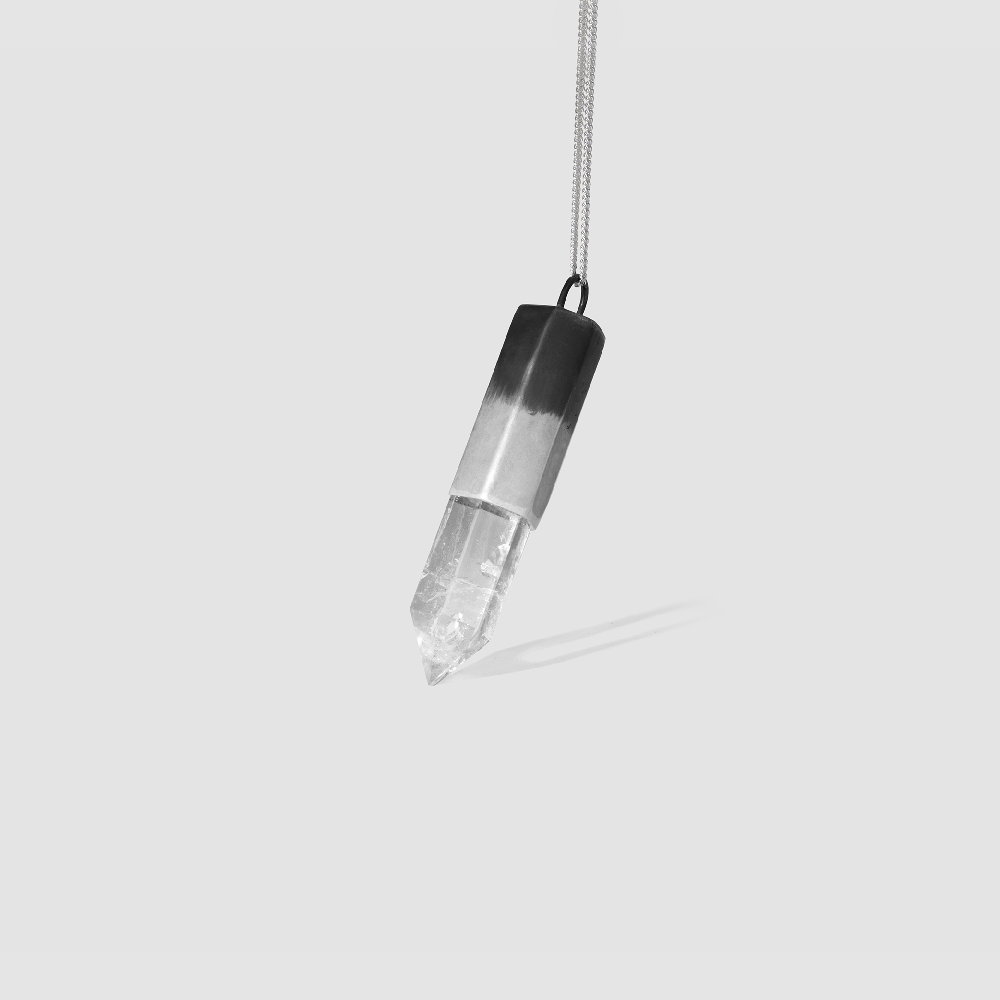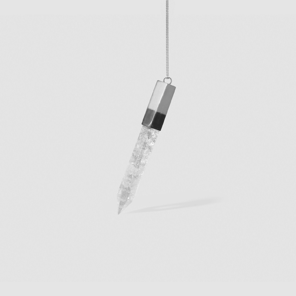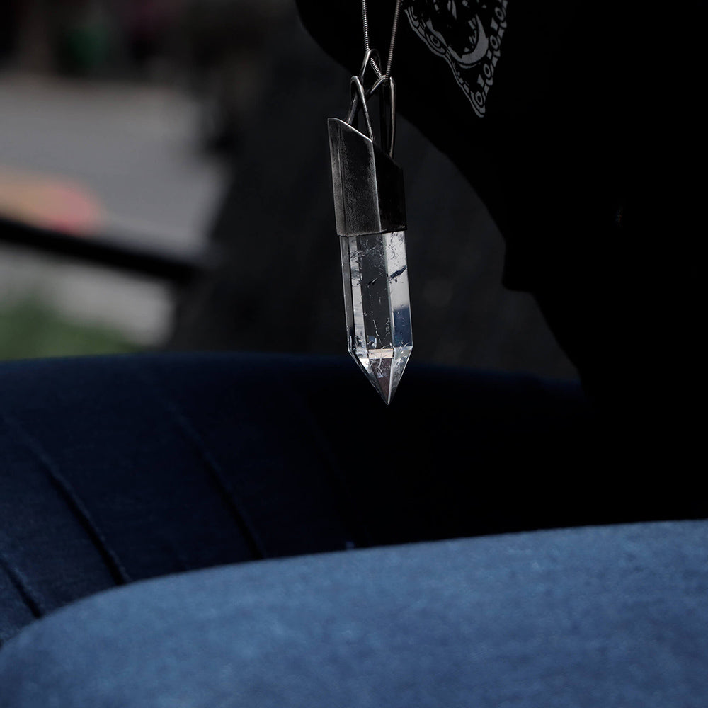 Punta de cuarzo cristal con engarce y cadena de plata 9.25, de 6cm a 14cm de largo aproximadamente.