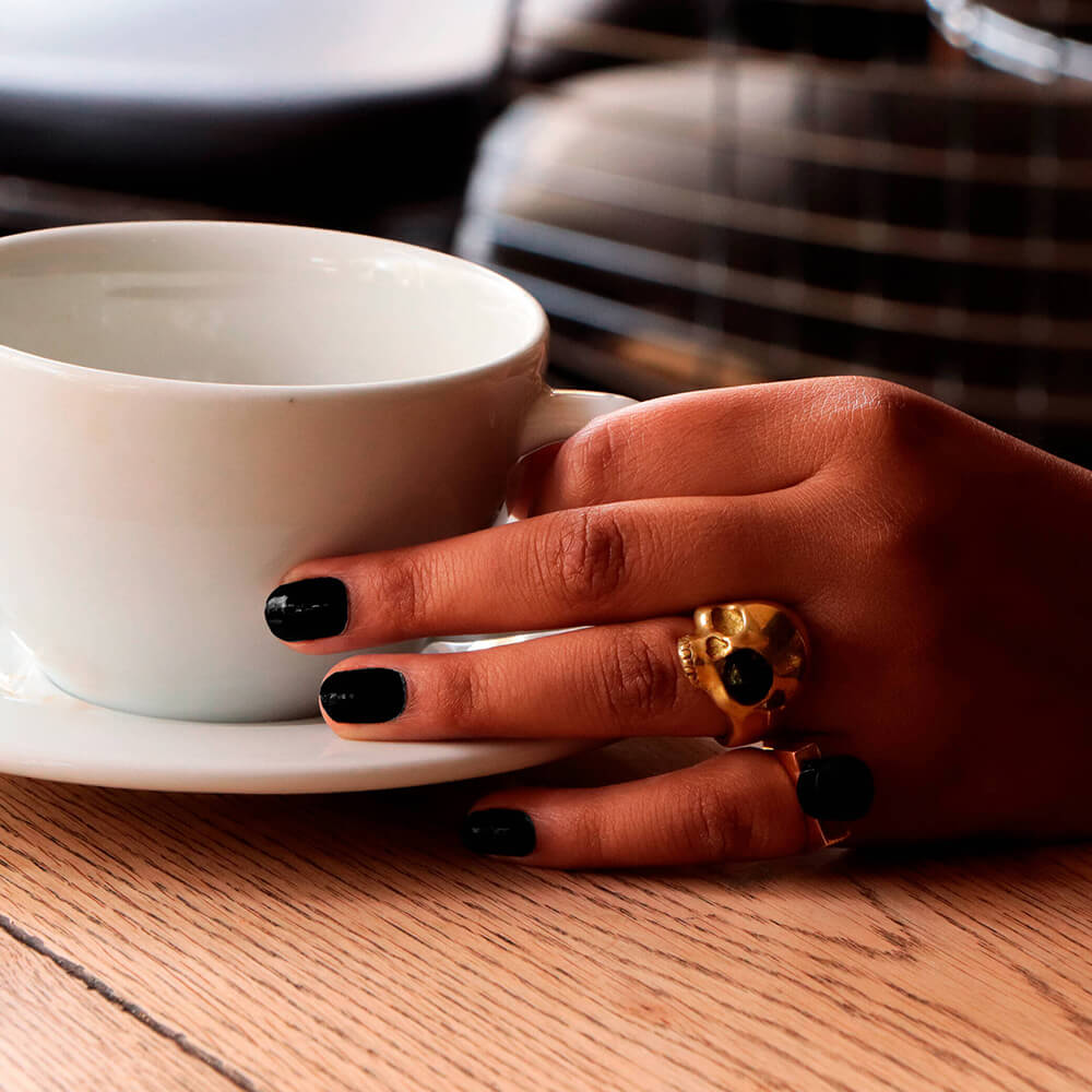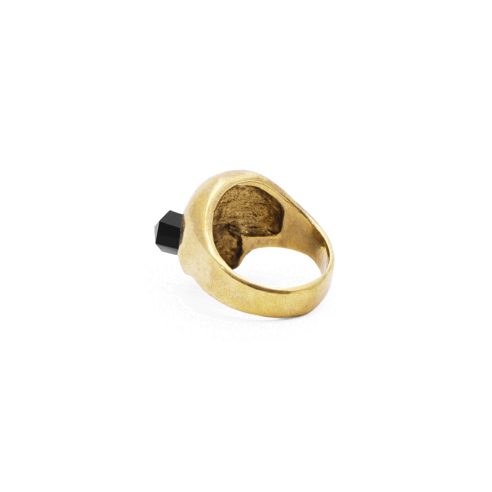 Anillo craneo de bronce con chapa de oro de 22 quilates con estaca de obsidiana negra.
